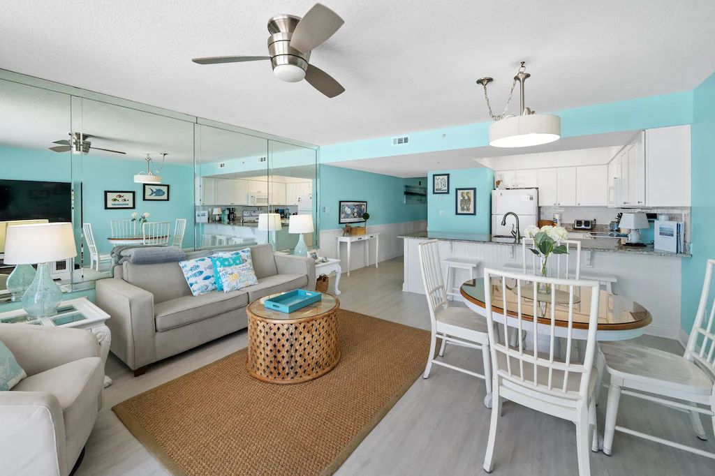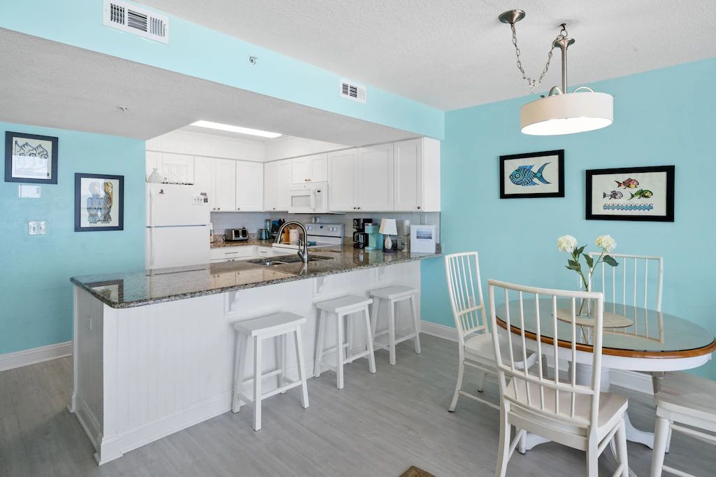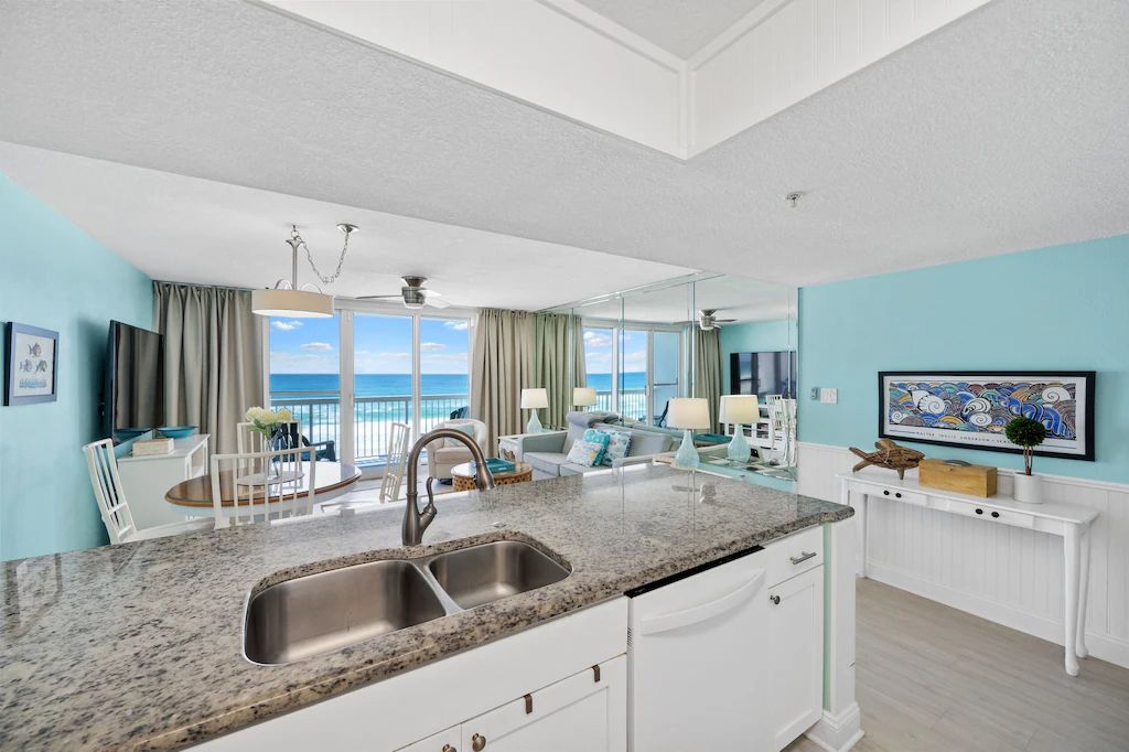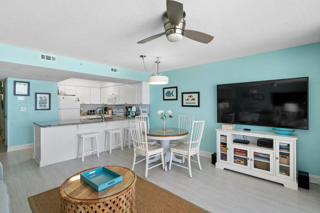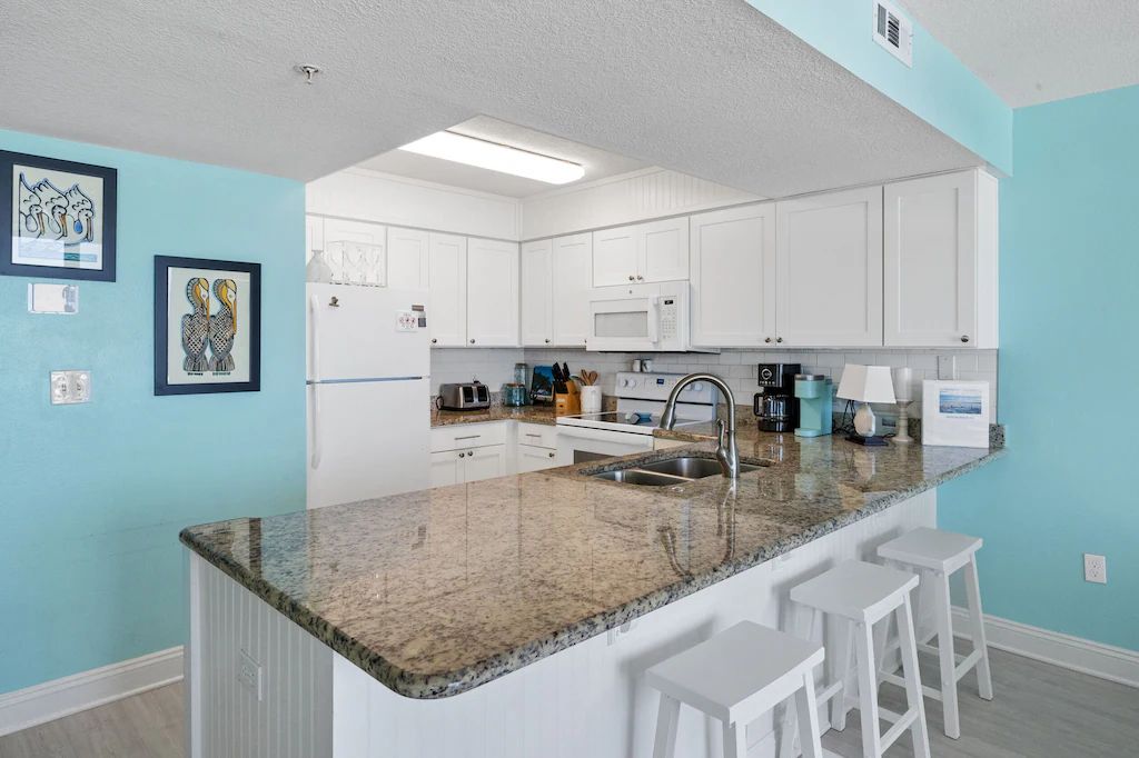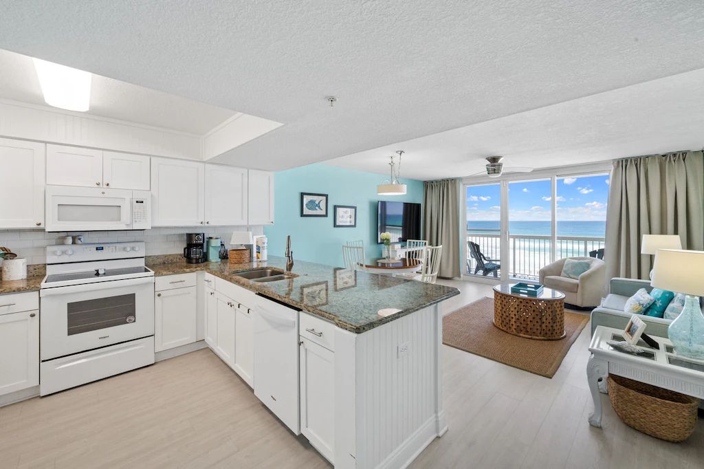 The unit has new flooring, appliances, and drapes along with many other updates. It has granite counter tops, built-in bunks, new kitchen cabinets, tile back splash, under-cabinet lighting, new bathroom vanities, new furnishings, and much more!! The unit has a 70" smart TV and DVD with streaming capabilities in the living room and a stereo with Bluetooth capabilities. Bedroom is also equipped with a 55" TV and a smart DVD player. The unit has books, games, and family-friendly DVDs. It is nice, bright unit directly on the beach with wonderful views.