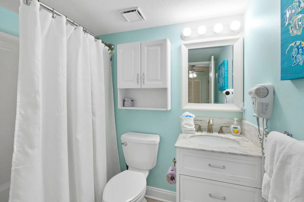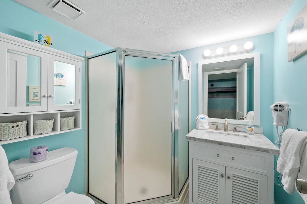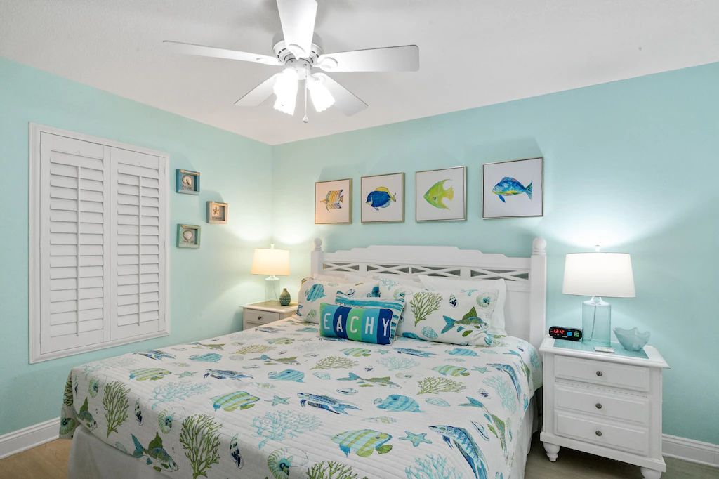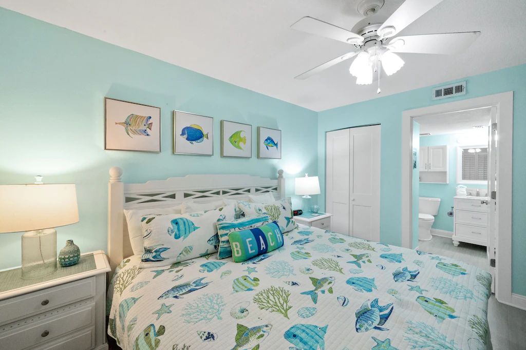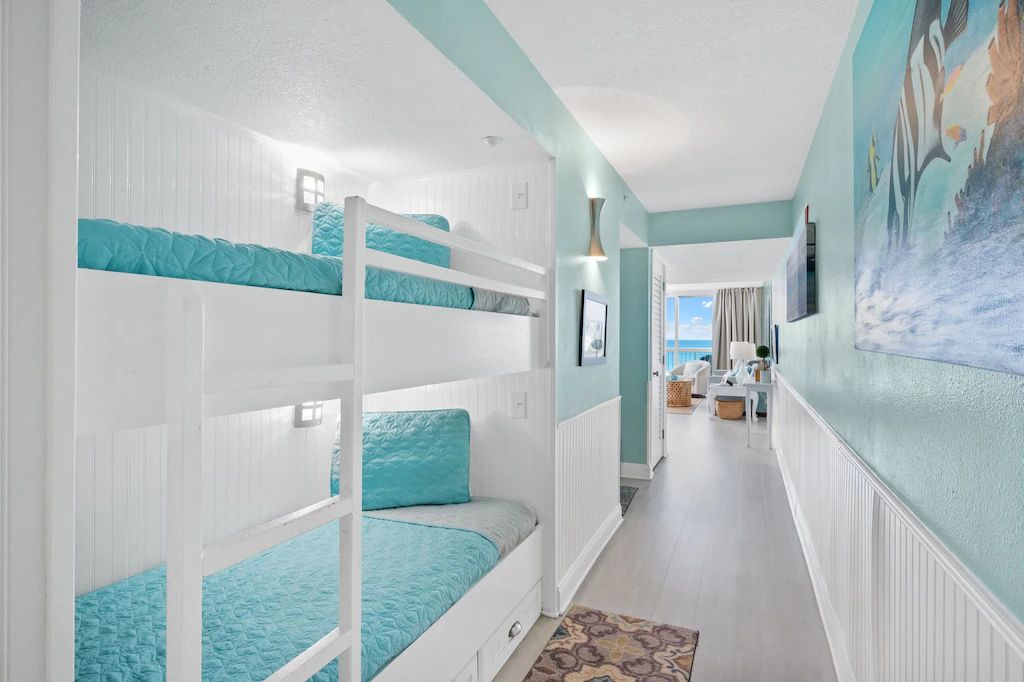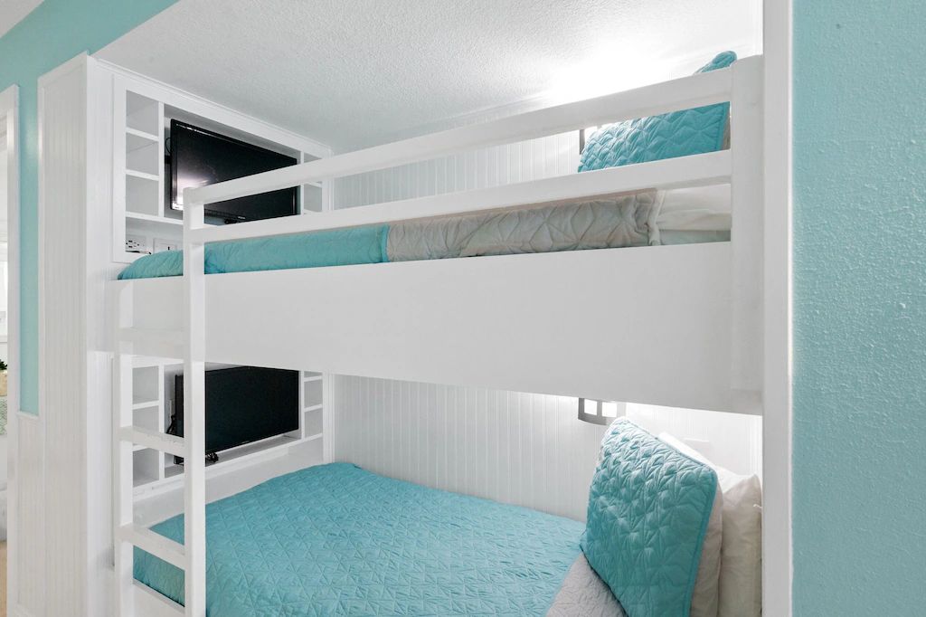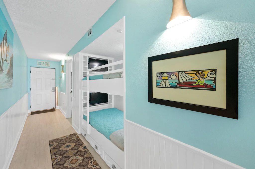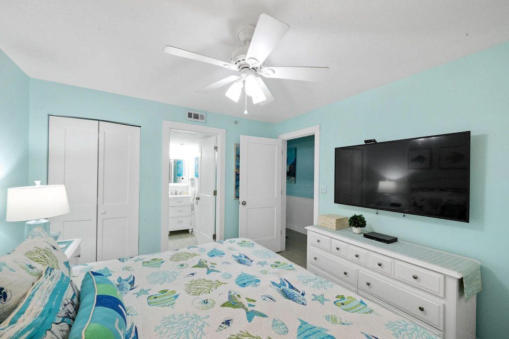 The unit has a king-size bed in the newly-decorated master bedroom, two bunk beds with individually-mounted Roku TVs in the hallway, and a queen sofa sleeper with Cozy Comfort mattress in the living room. There is an en-suite bathroom in the master with shower/tub combination and a second bathroom equipped with a shower.