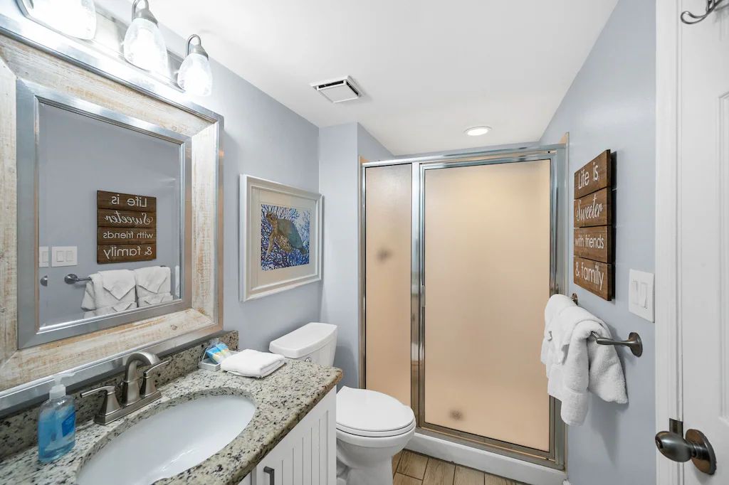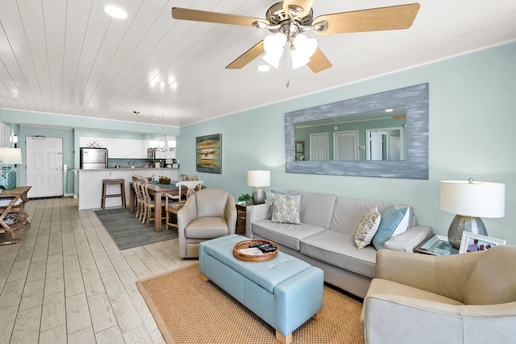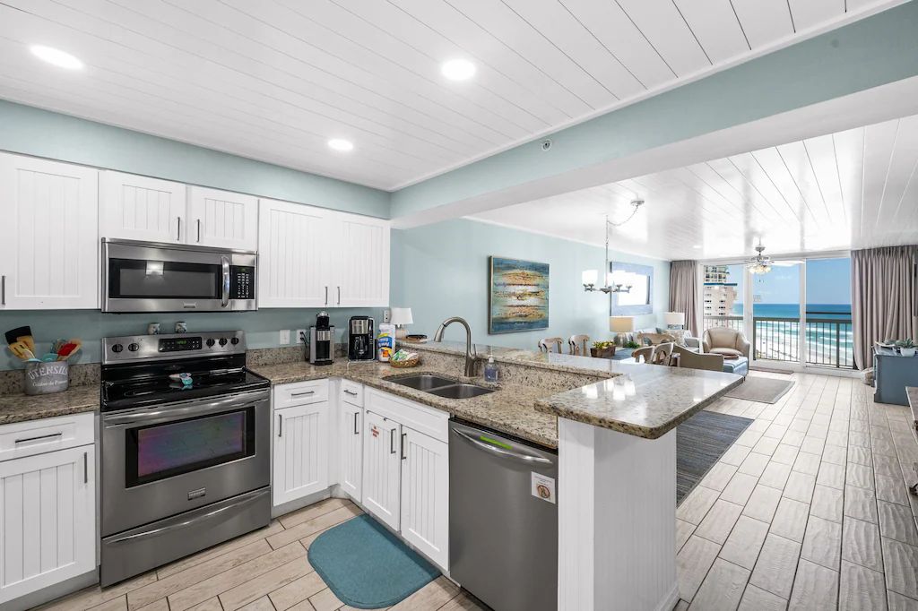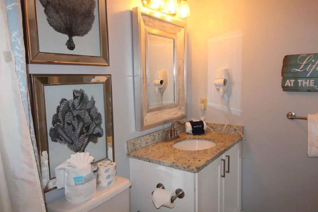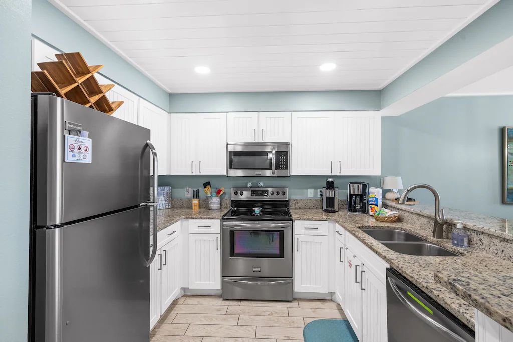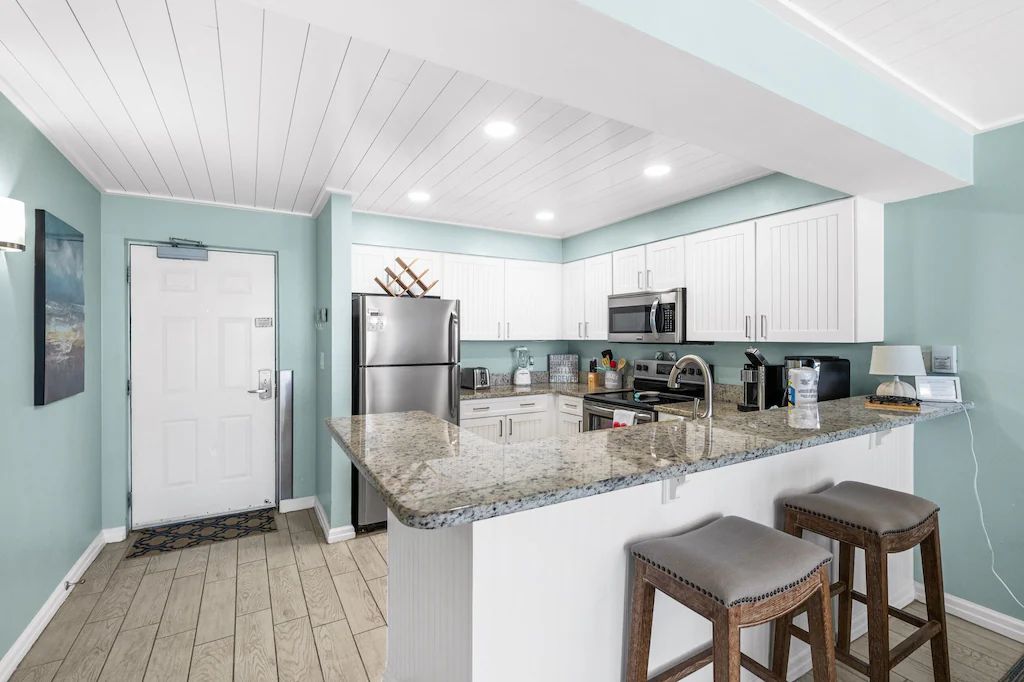 Fully-furnished kitchen and baths. Chef-ready kitchen has all small appliances, fully stocked with pots and pans, dishes, utensils, and serving pieces. There are both a regular coffee pot and a Keurig. Newly-redecorated and painted, granite in the kitchen and bathrooms, shiplap ceilings, new furnishings, and new flooring throughout. There is a washer and dryer in the unit. Starter supplies furnished (no replenishments).