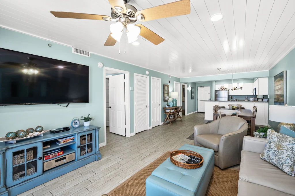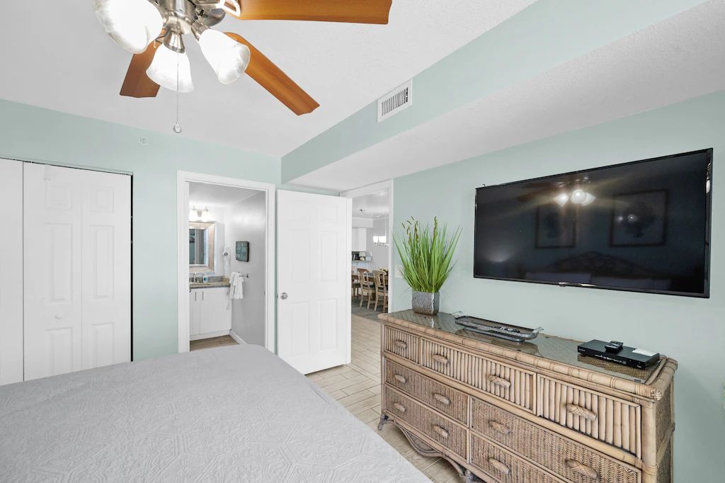 The living room has a queen sleeper sofa, a 65” 4K TV, smart DVD player, and Bluetooth stereo. Master bedroom has a king-size bed with new pillow-top mattress and box springs (new as of spring 2018), en-suite bathroom, and new 50” 4K TV with a smart DVD player. The master bedroom has sliding doors accessing the large balcony with ocean view. The second bedroom with en-suite bathroom has twin beds with a 50" 4K smart TV and smart DVD player. With the smart TVs and DVD players, you can access all of your favorite movies and shows on Netflix, Hulu, and other streaming networks.