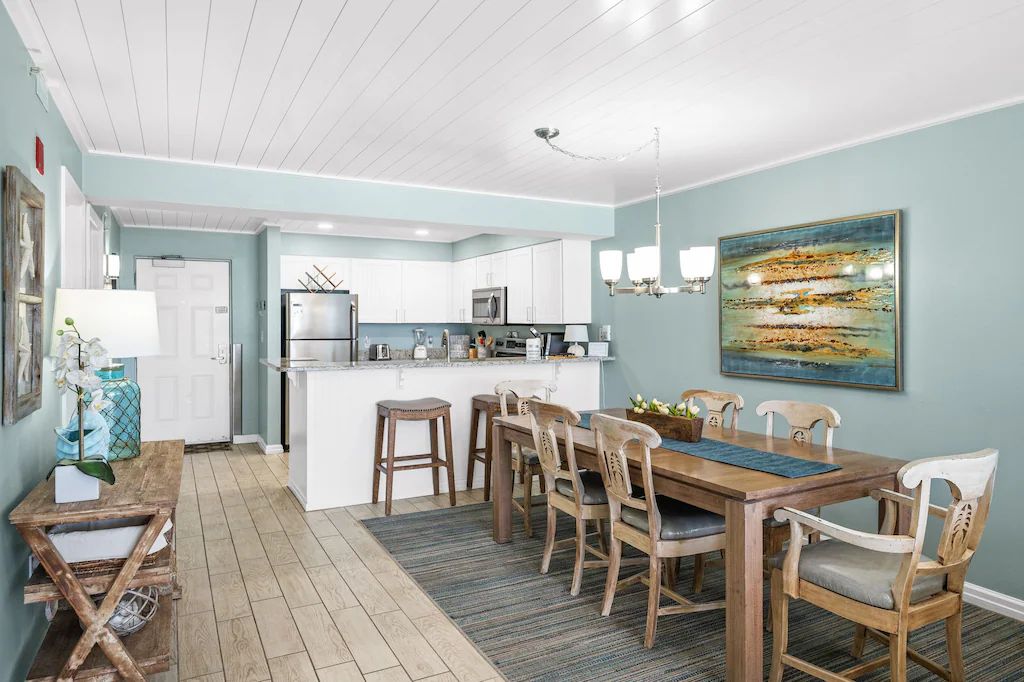 This resort has a private beach. There is a cafe and Tiki bar (open March 1-October 31) and you never have to leave the resort. Several restaurants are within walking distance for take-out. Walmart and Winn Dixie have grocery pickup.