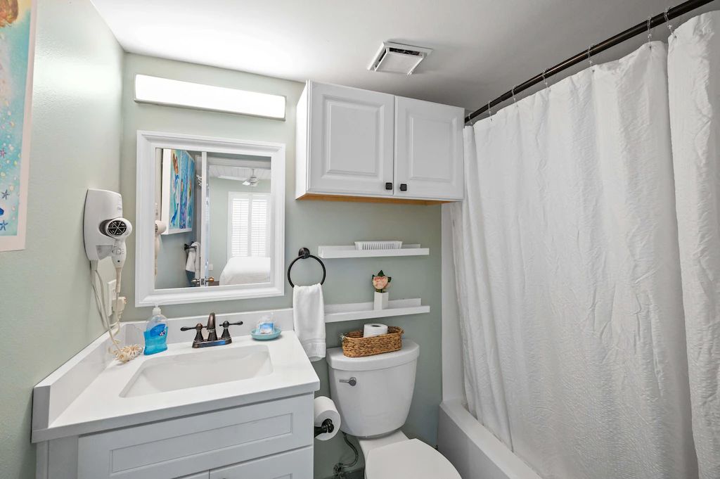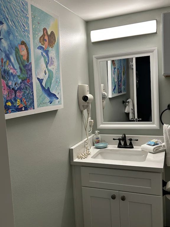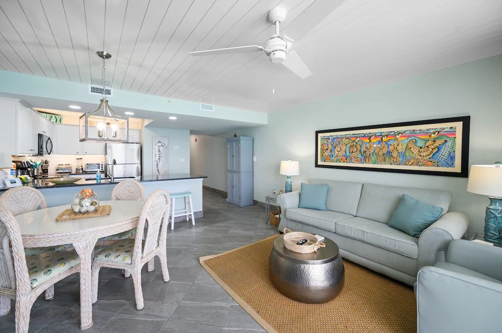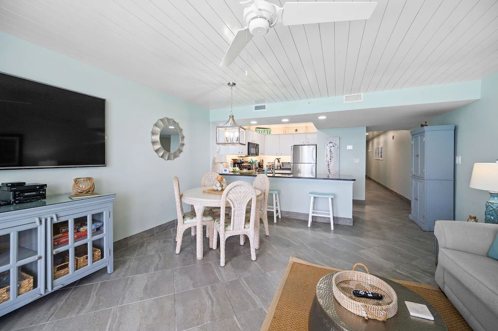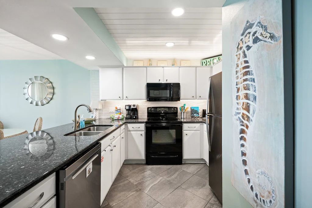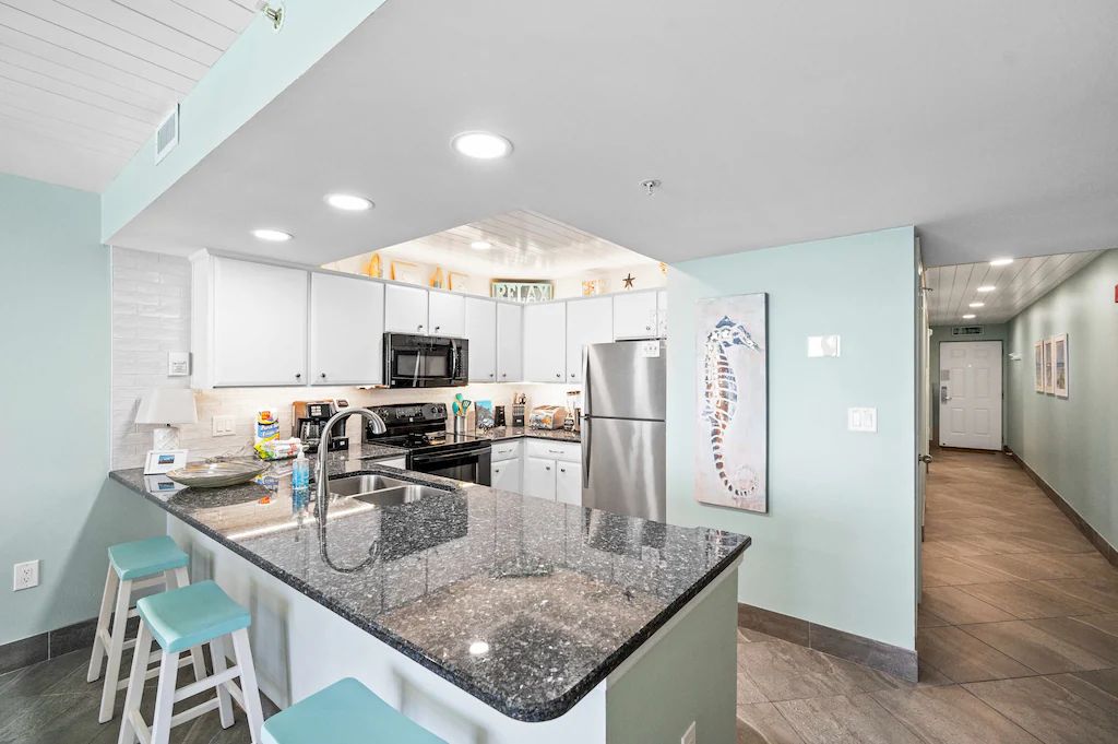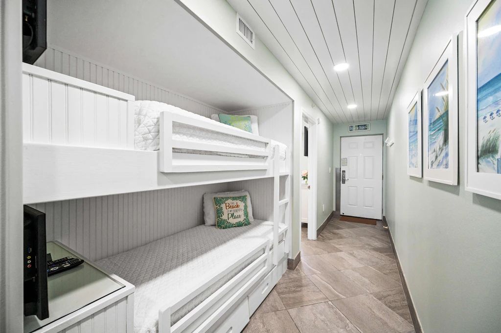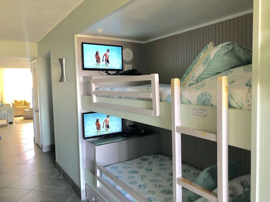 The living room has a 70" 4K Ultra HD TV streaming capabilities, smart DVD player, and Bluetooth stereo. Kids will love the built-in bunks with individually-mounted 24" Roku TVs and DVD players. It is a furnished one-bedroom unit directly on the beach with two bunk beds with new mattresses in the hallway and a new queen sofa sleeper with Cozy Comfort mattress. It has granite countertops in the kitchen, new bathroom vanities, flooring, and furnishings.